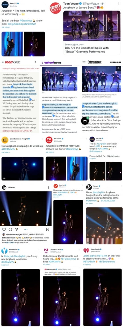 In the performance at the scene of the political situation is an American news magazine 'Extra tv' (extratv) "▽ jungkook the next james bond" (The political situation : the next generation of James Bond), mention 'I think 007 series' James Bond film and best tribute.