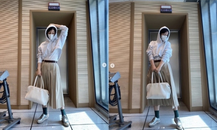 The radio booth in front of Choi Hwa Jung in putting together two pictures of a sporty design unique fashion style with a pleated skirt in the hood of the crop is flexing its muscles.