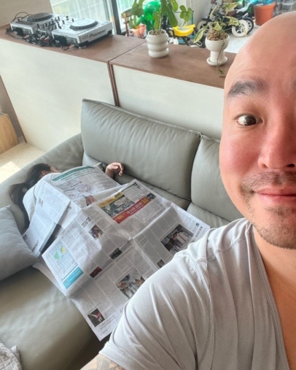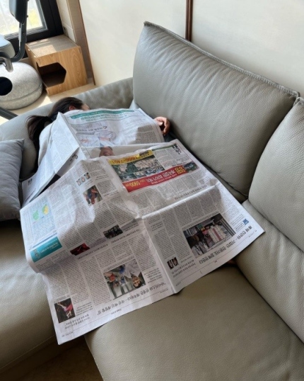 Open length in the picture on the sofa covers with newspaper to his sleeping wife and taking injeungsyat.Instead of blanket full of mischief of the road covering the daily newspaper is laugh.