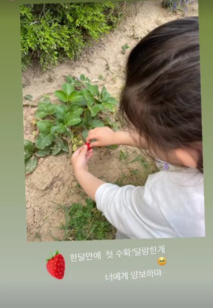 Choi Ji-woo are picking strawberries is the daughter of a person a picture released.A cute touch, and the strawberries with the cute little hands from behind raenseon of my aunts, uncles, raised a smile.
