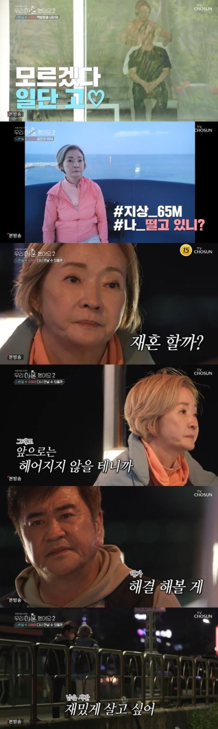 그는 "자기도 많이 변했고 지금도 변해가고 있다. 지금은 다 좋다.It all feels like now, not difficult.Isn't there is a problem or a number of difficulties in reality house.Each saldeo people living in the same house might be taking risks.But once I get so old it should not break up again.Well, basically I think a lot.That's going any time it a lot with positive thoughts, when the concrete thing is that I would just do it.We'll see about living. 앞으로 헤어질 일은 없을것 같은 생각이 든다"며 "이제 하나하나 풀어나가자"고 말했고, 나한일은 "내가 장담은 못하지만, 현실적인 문제들 아주 만족하진 못하겠지만 한번 해결해보겠다"고 받아들였다.