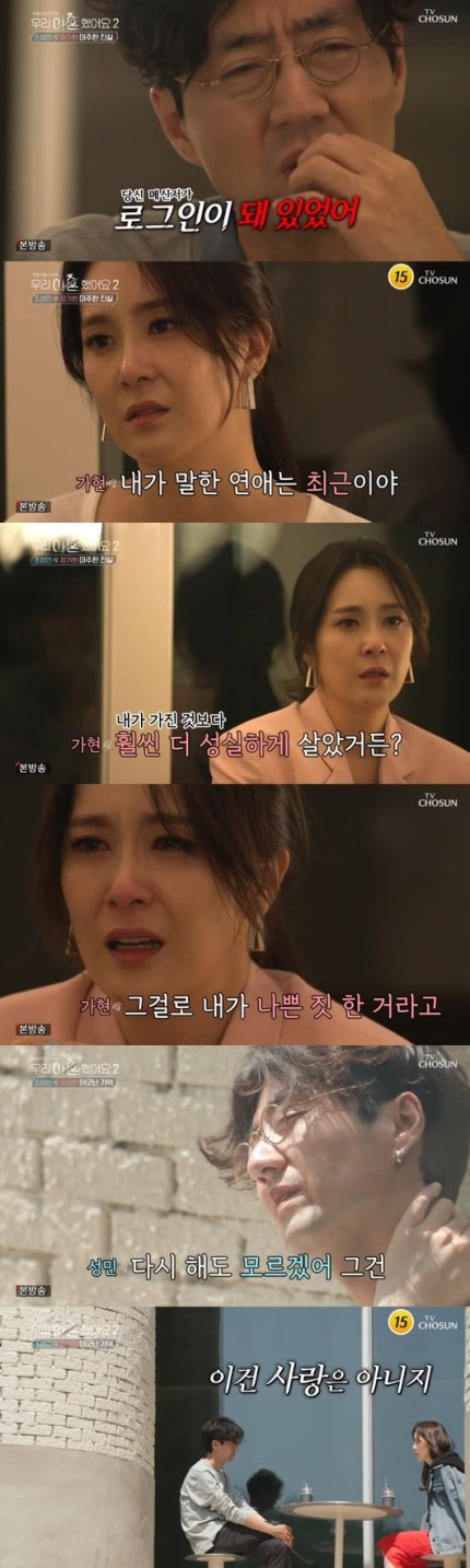조성민은 "나도 그렇게 부정적으로 생각이 드니까 대수롭지 않은 대화들도 많은 상상을 하게 됐다"며 "지금은 부끄럽다. 부끄러운데 그냥 고백하는거다"라고 털어냈다. 이에 장가현은 "난 내가 성실한 아내라고 생각했다. 본성을 거스를만큼 성실하게 살았다고 생각했다. 원래는 게으르고, 그만큼 열정 갖고 사는 사람이 아니다. 내가 가진것보다 훨씬 더 많이 성실하게 살았다"며 "당신한테 미안하고 고맙단 얘기 하려고 생각하고 왔는데.."라고 눈물을 쏟아냈다.
