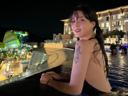 In this photo shows bold and the exposure, such as wearing swimsuits is yulhui.Capture the Tattoo a big arm in the eyes of the yulhui.
