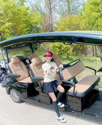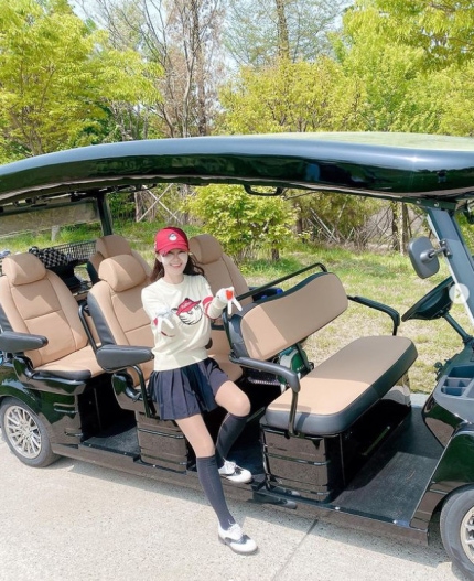 Shown with photos showed in a pose in front of the cart out of golf in the gimjimin.At the camera somewhere, not a bright smile and caught my eye or expression of the gimjimin.