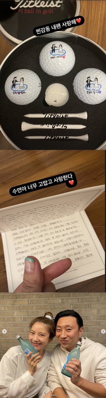 Son Dam-bi is a gift received in the picture the set of golf balls.Custom-made golf balls 'Kyuhyuk ♥ a marten cat' with a juicy picture on the 'I love you forever' 'Kkot-gil walk.' inscribed with phrases such as.