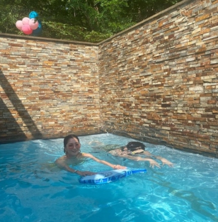 He is Min with a swimming pool on vacation in appearance.Feel happiness in your face two wet head over heels in water.Oh Yun-ah was affectionately to 'Mom smile' and take care of the Min in the water.