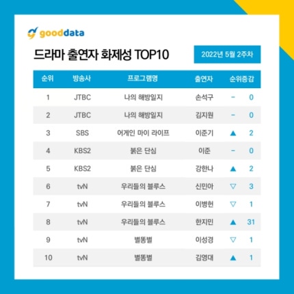 이는 한국방송콘텐츠 경쟁력 분석 전문 기관인 굿데이터코퍼레이션이 발표한 굿데이터 TV화제성 드라마 순위는 2022년 5월 9일부터 2022년 5월 15일까지 방송 중이거나 예정인 드라마 22편을 대상으로 뉴스 기사, 블로그/커뮤니티, 동영상, SNS에서 발생한 네티즌 반응을 분석한 결과이다.
