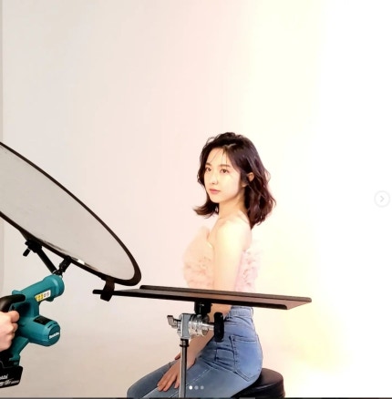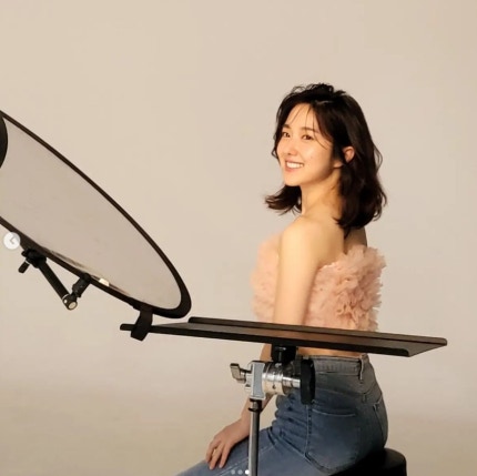Open iyeseong the picture is a Pink color tube top with blue jeans and photo shoot in and doing who-knows-what.Cute, and her fans caught the eye of thin shoulders and forearms.