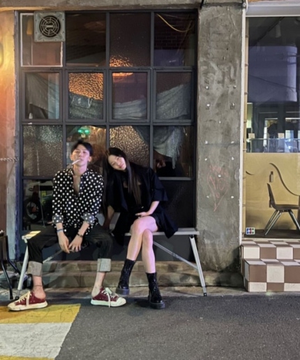 The two are sitting side by side in a chair in front of a store appearance.G. Dragon also has a dot pattern short roll-up shirt and jeans match, showed off her extraordinary fashion sense.The Kim Ah Hyun is a simple style my hair black sophisticated atmosphere.