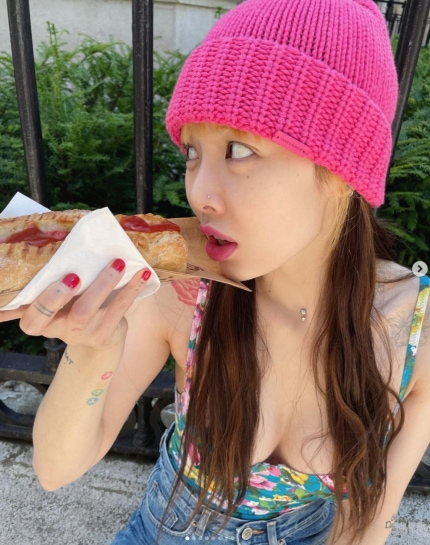 Hyun-ah received a rather modest a sandwich for a woman´s unpainted face and basked in the sun.Especially breast bone that exposes one's view some attention in and upper body.