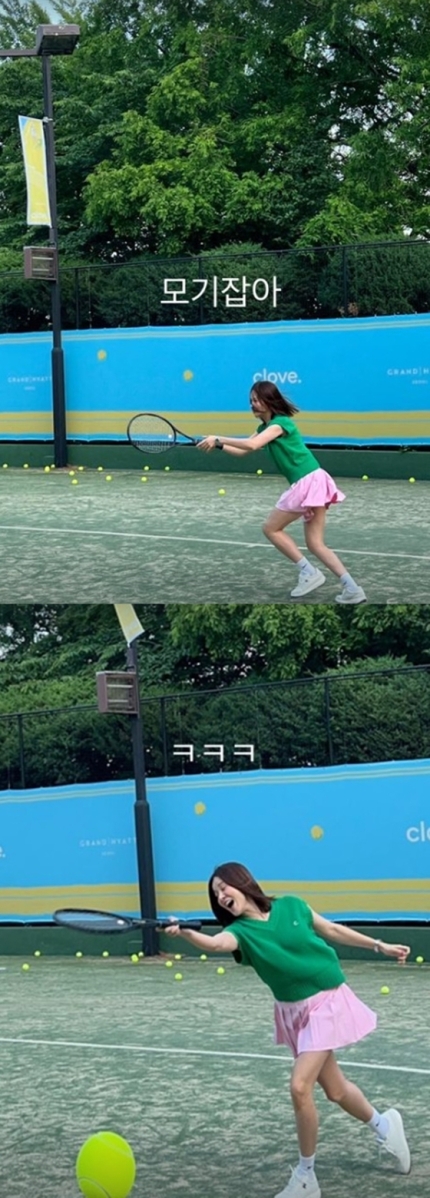 A picture released 'It's kill mosquitos.', and with the words 'LOL'.Gag show off a good sense and Ivy has been a tennis racket in the picture.Kneel down to comedians, a comic routine.Beauty fans with a present of laughter causing laughter than a comic look look, too.