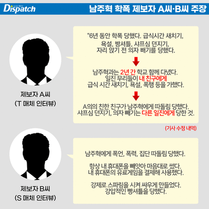 제보자 A씨는 6년 동안 학폭을 당했다고 주장하다, 3년으로 바꿨다. "뒷자리에서 샤프심을 던지는 행동을 저질렀다"고 하다가, "샤프심은 다른 일진 무리가 던졌다"고 또 정정했다.