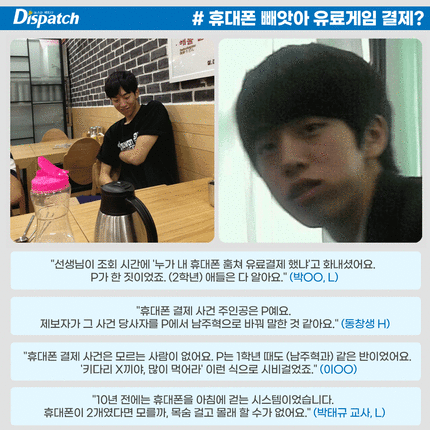 " Then (2011) was when corporal punishment is allowed.Suilgo is kids educated and severely than other school.Walking a cell phone system in the morning.The atmosphere is so strict that the secret it's hard to (a cell phone)." (teacher baktaegyu).