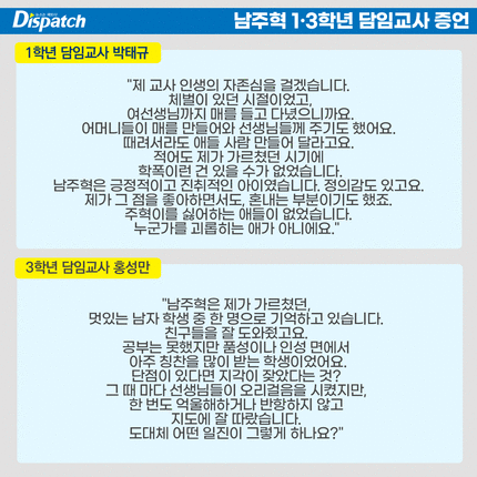 "아니 땐 굴뚝에 연기 났다는 댓글을 봤어요. 정말 공감이 됐죠. 남주혁은 긍정적이고 진취적인 아이였습니다. 정의감도 있고요. 제가 그 점을 좋아하면서도, 혼내는 부분이기도 했죠. 주혁이를 싫어하는 애들이 없었습니다. 누군가를 괴롭히는 애가 아니에요. 제 증언, 얼마든지 쓰셔도 됩니다. 그만큼 자신있으니까요." (박태규)
