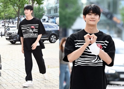 A casual, wearing all black clothing of Kang Taeo is a big man compared with Hart poses a cute little hand that attracted attention.