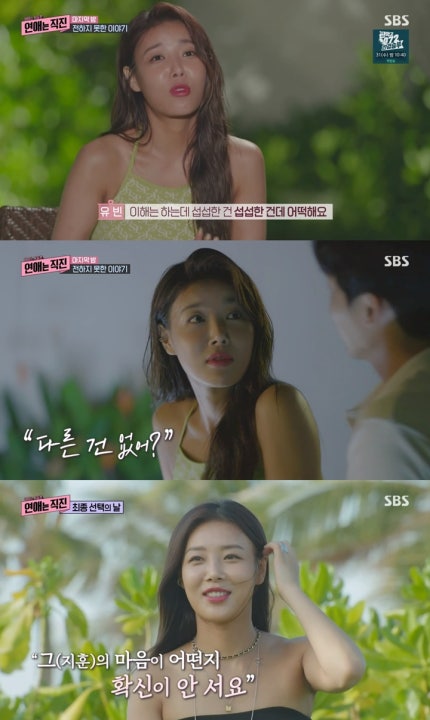 계속해서 데이트를 함께했던 지훈의 변심에 충격을 받았던 유빈은 최종 선택 전까지도 "그의 마음이 어떤지 확신이 안 선다"라며 끝까지 고민하는 모습을 보이기도 했다.