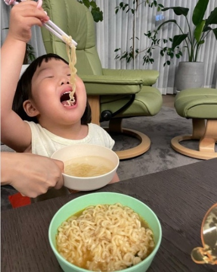 Shown eating noodles at this picture, daughter showed the amount of me introduce myself.Ha-Yeong sheep eating noodles with chopsticks is directly close your eyes, and storm and eating broadcasts.