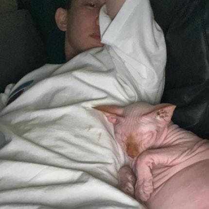 Yoo Ah-in hidden for more than half of the arms up in the face is staring at the camera in one eye.The next pink cat is lying comfortably under the armpit of the Yoon Seung.19-year-old actor Yoo A-in became an pictures, but also when the cat slept as if he seems to feel sleepy.