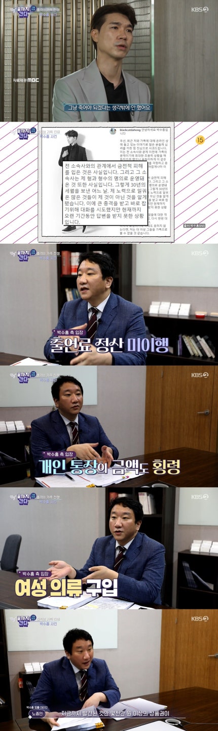 Bakssuong attorneys is "one´s legal seal, Mr. bakssuong otp brother while managing everything, including bank accounts, corporate settlement in a partially fulfill personal bank accounts, and possessing an embezzled again double the amount embezzled broke the law.", and it's corporate credit card details, women's clothing purchases, private payments.Never paid the people who don't see in the agency, Mr. bakssuong, go.그러면서 "정기적으로 거액의 상품권 구입 내역이 있다"며 "박수홍 씨 형의 주장에 따르면 윤정수 씨, 박경림 씨 등 친분이 사람들에게 선물을 주기 위한 용도였다고 주장하고 있으나 박수홍 씨 형에게 선물을 받은 사람은 아무도 없다.Evaporation are some ten million won or more certificates are the details of how they've used, did.