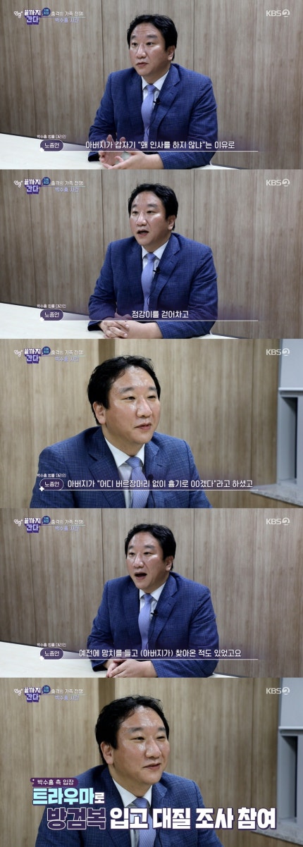 There are faces survey about the circumstances of the legal representative of the bakssuong.박수홍과 큰형, 형수, 아버지가 모여서 대질 조사를 시작하려는 순간 아버지가 갑자기 '왜 인사를 하지 않느냐'는 이유로 정강이를 걷어차고, 박수홍 씨가 '왜 때리냐'고 하자 아버지가 '어디 버르장머리 없이 흉기로 XX겠다'라고 하셨다"며 "예전에 망치를 들고 찾아온 적도 있었다.Assault, you do if you angry since childhood.He said, "pain and trauma banggeom to have dressed for faces joined the investigation.", and it's "physical trauma that were given the biological son, but The wound was not big, you can't imagine".