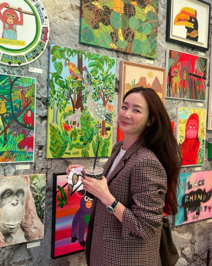 Choi Ji-woo is looking at one exhibition hall and enjoy various paintings.Other camera holding a mask and sunglasses in one hand and coffee cup in his beauty of the many smiling and looking attract public gaze.