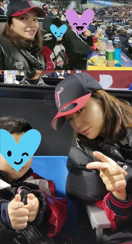 Hwang Jung-eum the husband, son and his Sunday best in baseball field.