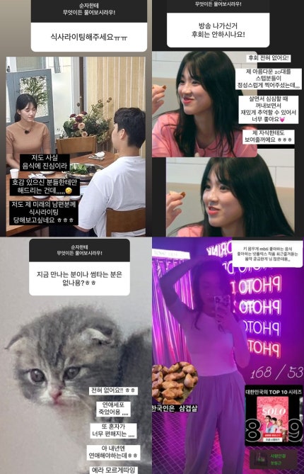 한 팬은 "가슴 수술했어요?One fan said, "Did you have a chest surgery?" 예뻐요"라고 물었고 순자는 "수술 얼굴, 몸 다 안 했어요I asked her if she's pretty and she didn't do surgery on her face or body.^^ 고루고루 통통한 편입니다"라고 답했다.^^ I'm rather chubby." 현재 연애를 안 하고 있다는 순자는 "연애세포 죽었어요.Sun-ja, who is currently not in a relationship, said, "Love cells are dead. 또 혼자가 너무 편해지는…I feel so comfortable being alone again.아 내년엔 연애해야 하는데 에라 모르겠다"고 털어놨다.Oh, I have to go out next year, but I don't know."