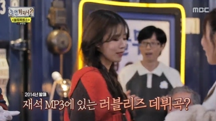 그러던 중 유재석은 "어?!Then, Yoo Jaeseok said, "Huh?! 나 소름 돋았어"라며 한 곡을 재생했다.I've got goosebumps," he said. 그리고 노래가 나오자 이미주는 "나 이거 데뷔 때 노래"라며 마찬가지로 놀랐다.And when the song came out, Lee Mi-joo was equally surprised, saying, "This is my debut song." 바로 러블리즈의 데뷔곡 '캔디 젤리 러브'(Candy Jelly Love) 이었다.It was Lovelyz's debut song Candy Jelly Love.