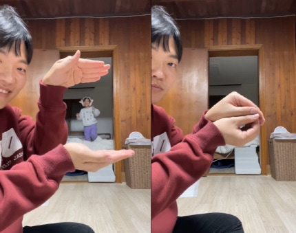 최고기는 음악에 맞춰 손을 열고 솔잎이가 짠 하고 나오는 듯한 영상을 찍었다.The best player opened his hands to the music and filmed a video of pine needles coming out.