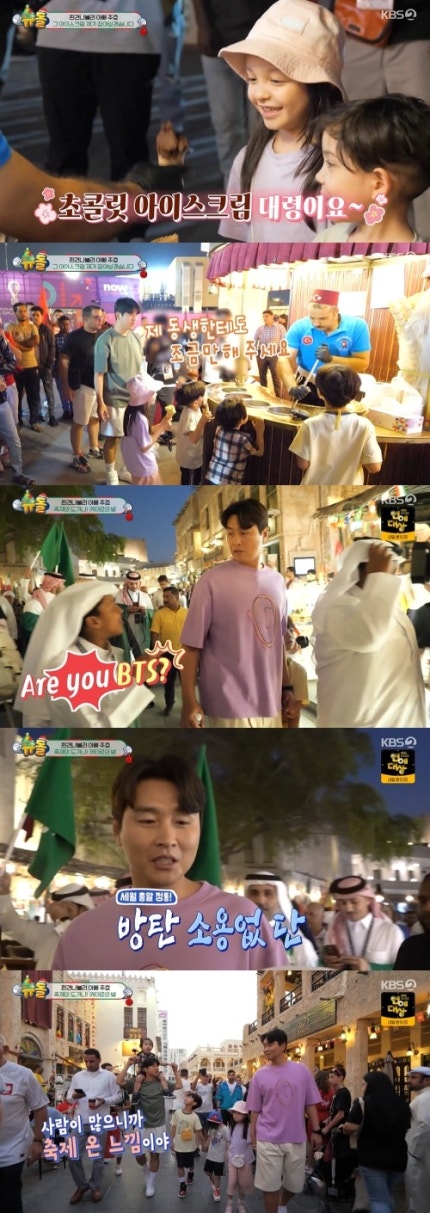 글로벌 축제, 빅 스포츠 이벤트인 카타르 월드컵을 즐기는 이동국, 박주호 가족의 모습이 그려졌다.Lee Dong-guk and Park Joo-ho's family enjoying the Qatar World Cup, a global festival and a big sports event, were depicted. 두 아빠는 아이들과 함께 번화가로 향했고, 박주호는 거리를 가득 채운 전 세계 사람들에 놀라며 “사람이 많으니까 진짜 축제 온 느낌이야”라고 감탄했다.The two fathers headed to the downtown area with their children, and Park Joo-ho was surprised by the people all over the world who filled the streets and admired, "It feels like I'm at a real festival because there are many people."