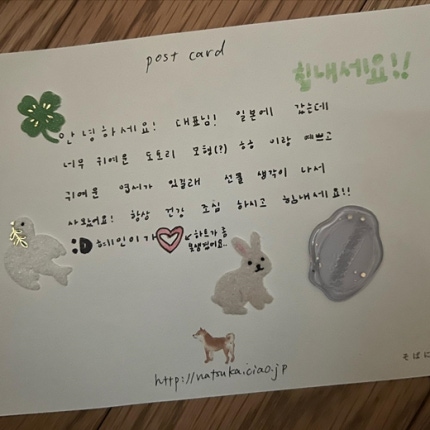 가장 먼저 공개한 건 뉴진스 혜인이 쓴 엽서.The first one to be released was a postcard written by Hye-in of New Jin's. 혜인은 "안녕하세요! 대표님!Hyein said, "Hello, CEO!" 일본에 갔는데 너무 귀여운 도토리 모형(?) ㅎㅎ이랑 예쁘고 귀여운 엽서가 있길래 선물 생각이 나서 사왔어요!"라면서 민희진 대표에게 "항상 건강 조심하시고 힘내세요!When I went to Japan, there was a very cute acorn model (?) and a pretty and cute postcard, so I bought it because I thought of a gift! I always told CEO Min Hee-jin, "Take care of your health and cheer up! 혜인이가"라고 전했다.said Hye-in. 하트도 그려넣었는데 혜인은 "하트가 좀 못생겼어요"라고 덧붙여 미소를 불러일으켰다.I also drew a heart, but Hye-in added, "The heart is a little ugly," raising a smile.