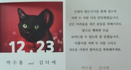 박수홍 씨 청첩장 (출처 유튜브 채널 검은고양이 다홍)Park Soo Hong's wedding invitation (Source: YouTube channel, Black Cat, Dahong)
