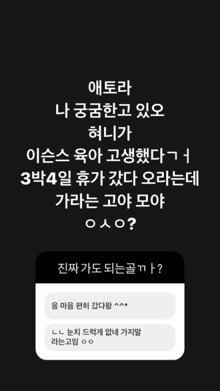 그러면서 "응 마음 편히 갔다와", "눈치 드럽게 없네.Then he said, "Yes, go ahead and relax." "You're so tactless." 가지 말라는 거임"이라는 상반된 선택지를 만들어 의견을 구했다.I made a conflicting choice of "don't go" and asked for his opinion. 이에 누리꾼들도 저마다 선택지에 투표하며 다양한 이야기를 내놔 눈길을 끌었다.Netizens also drew attention by voting for each option and presenting various stories.