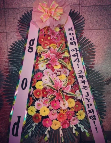 화환에는 “god의 아버지!The wreath said, "God's father! 그루부는 JYP처럼!!”이라는 재치 넘치는 문구가 담겨있어 웃음을 자아냈다.Groovy drew laughter with the witty phrase, "Like JYP!"