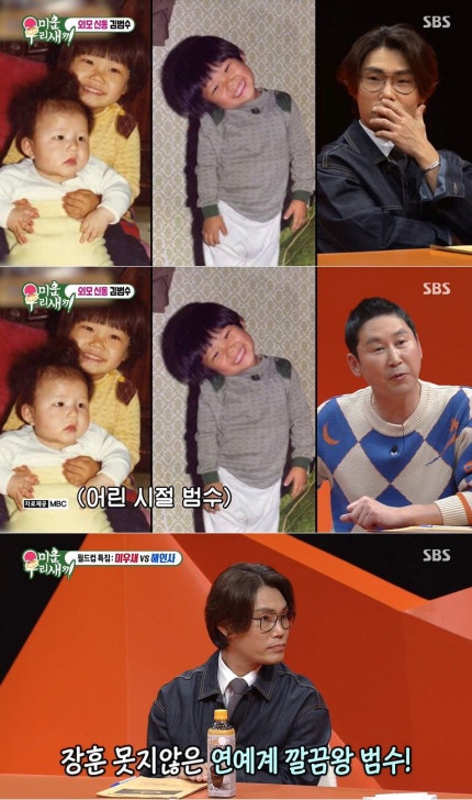 신동엽은 또 김범수의 귀여웠던 어린시절이 공개되자 "웬만하면 다 귀여울 나이"라고 말해 웃음을 자아냈다.Shin Dong-yeop also drew laughter when Kim Bum-soo's cute childhood was revealed, saying, "Most of them are at the age to be cute."