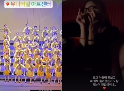 이어 공개한 영상에서는 딸의 공연을 보며 눈물을 훔치고 있는 윤혜진의 모습이 포착됐다.In the following video released, Yoon Hye-jin was seen wiping tears while watching her daughter's performance. 그는 자신을 몰래 촬영한 친구에게 "즈그 아들램 안 보고 내 찍찍 우는 거 도촬하는 거 영 밉상이네"라고 말하면서도 하트 이모티콘을 덧붙이며 애정을 드러내 웃음을 안겼다.He added a heart emoticon and made a smile, saying to a friend who secretly filmed him, "It's disgusting to film me crying without watching Zerg's Sonram."