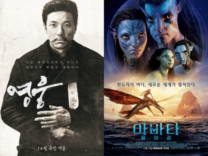 [스포티비뉴스=유은비 기자] 12월, 한국과 미국의 기대작 '영웅'과 '아바타: 물의 길'이 얼어붙은 극장가를 뜨겁게 달군다.[Spot TV News = Reporter Yoo Eun-bi] In December, Korean and U.S. expectations of "Kick It" and "Avatar: The Road to Water" heat up the frozen theater district.