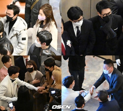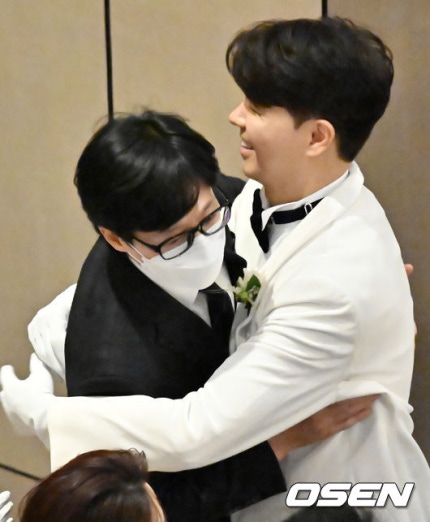 유재석은 박수홍과 진한 포옹을 나누며 박수홍의 결혼을 진심으로 축하했고, 강호동, 지석진, 김국진 강수지 부부, 오나미, 이연복, 주영훈, 장성규, 이수영, 최성국 등 많은 스타들이 하객으로 참석해 자리를 빛냈다.Yoo Jae-seok sincerely congratulated Park Soo-hong's marriage by giving a deep hug to Park Soo-hong, and many stars, including Kang Ho-dong, Ji Seok-jin, Kim Kook-jin and Kang Soo-ji, Oh Nam-mi, Lee Yeon-bok, Joo Young-hoon, Jang Sung-kyu, Lee Soo-young, and Choi Sung-guk, attended as guests.