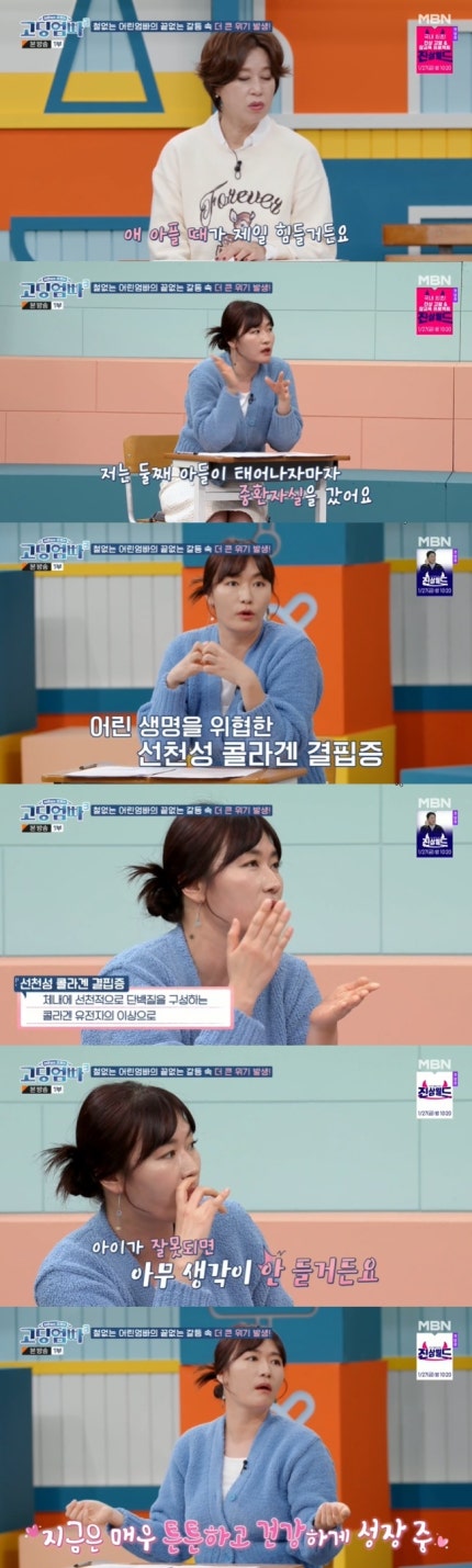 김미려는 “둘째 아들이 태어나자마자 중환자실을 갔다.Kim Mi-ra said, "As soon as my second son was born, I went to the intensive care unit. 아이가 선천성 콜라겐 결핍증이다.Children have congenital collagen deficiency. 저희 아들은 그나마 입천장에 구멍 정도였지만 숨을 못 쉬더라.My son had a hole in the roof of his mouth, but he couldn't breathe. 중환자실엘 갔는데 아이가 잘못되면 아무 생각이 안 든다”라며 “계속 지켜봐야 하는 병이지만 다행히 지금은 너무 건강하다”라고 말했다."I went to the intensive care unit, and if my child goes wrong, I can't think of anything," he said. "It's a disease that I have to keep watching, but fortunately, I'm too healthy now."