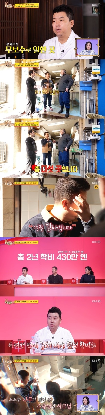 정호영은 유학 당시 이 가게에서 무보수로 일을 배웠다.When Jeong Ho-young studied abroad, he learned a job at this store without pay. 정호영은 "좋은 기술을 배운다는 생각으로 월급을 안 받아도 배우고 싶다고 해서 무보수로 일했다"며 덕분에 "손질부터 생선 보는 눈을 많이 배웠다"고 밝혔다.Jung Ho-young said, "I worked without pay because I wanted to learn even if I didn't get paid with the idea of learning good skills," adding, "I learned a lot of fish watching from preparation."