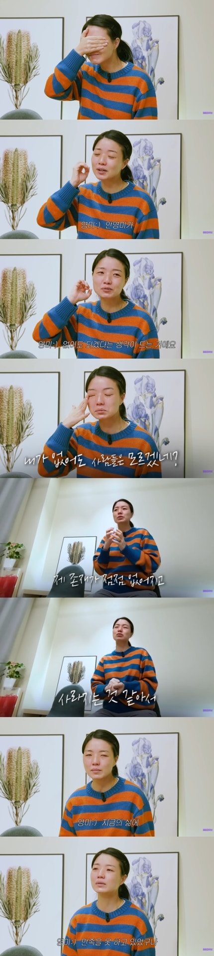 안영미는 “방송을 해도 충족이 안 된다.Ahn Young-mi said, "I can't satisfy you even if I do a broadcast. 성취감이 들지 않는다”며 “무대에서 관객들한테 에너지를 받는 게 크다.I don't feel a sense of accomplishment," he said adding, "It's great to receive energy from the audience on stage. 거기서 자존감이 올라간다.That's where my self-esteem goes up. 내가 짜서 내가 보여주는 게 없다 보니 안영미가 없어도 되겠다는 생각이 들었다.I thought I didn't need Ahn Young-mi because I didn't plan and show anything. 내가 없어도 사람들은 모르겠다”며 눈물을 보였다.People don't know even if I'm not there."