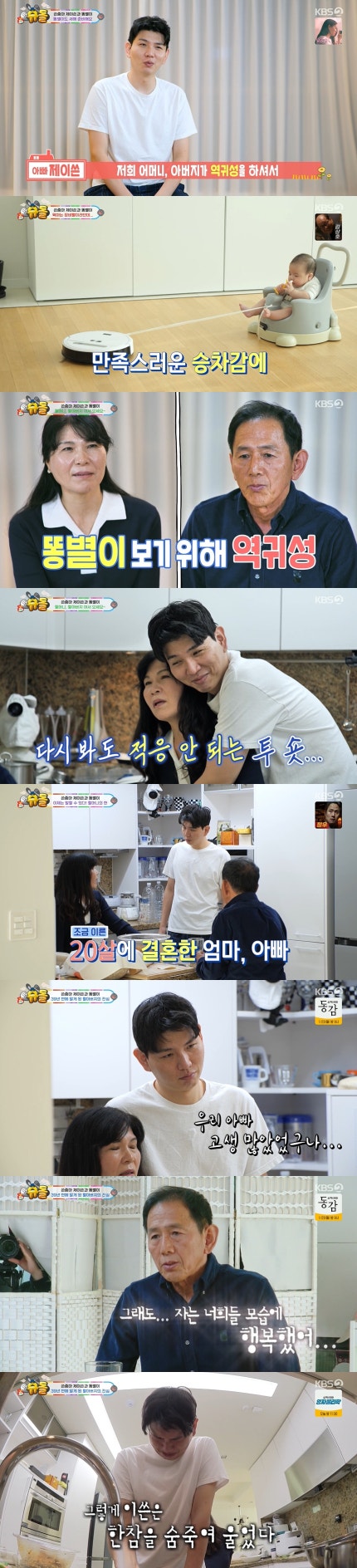 이후 제이쓴은 잠에서 막 깬 준범이를 데리고 나왔다.Then Jason brought out Jun-beom, who had just woken up. 어머니는 반가운 마음에 준범이 이름을 크게 불렀고, 제이쓴은 "조용히 해.His mother was so happy that Jun-beom called his name loudly, and Jason said, "Be quiet. 자잖아"라고 말했다.You're going to bed." 이에 부모님은 "너만 애 키우냐", "유난 떨기는"이라며 일침을 가해 웃음을 자아냈다.In response, the parents criticized him, saying, "Are you the only one raising a child?" and "He's making a fuss," drawing laughter.