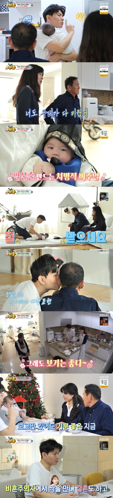 제이쓴은 준범이에게 꼬까옷을 입혀서 같이 세배를 했다.Jason dressed Jun-beom in a kakaotalk and bowed to him. 부모님은 "준범이가 있어서 너무 행복하다"며 감격했다.My parents were thrilled, saying, "I'm so happy to have Jun-beom." 또 제이쓴은 아버지, 준범이와 3대 사진을 찍으면서 아버지에게 볼 뽀뽀를 하며 살가운 모습을 보였다.Jason also showed a friendly appearance by kissing his father on the cheek while taking three major photos with his father and Jun-beom. 제이쓴은 "아빠한테 처음으로 뽀뽀한 거다.Jason said, "This is the first time I kissed my dad. 표현에 살가운 아들이 되고 싶은데 참 쉽지 않다.I want to be a kind son to express, but it's not easy. 그래서 사진 찍는 찰나에 눈 질끈 감고 뽀뽀한번 해봤다"고 털어놨다.So I closed my eyes and kissed her when she was taking a picture." 아버지는 "처음으로 큰 선물 받았는데 정말 고맙다.My father said, "I got a big present for the first time, and I really appreciate it. 아빠도 마음 변하지 않겠다"며 담담히 진심을 전해 뭉클함을 안겼다."I won't change my mind," he said calmly, expressing his sincerity.