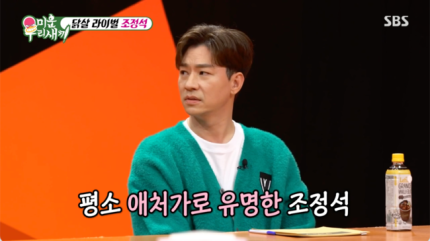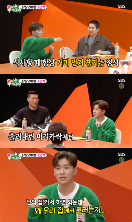 아내 거미한테 자상한 조정석에 대해 정상훈은 “같이 밥을 먹으면 항상 와이프를 많이 챙긴다.Regarding Cho Jung-seok, who was kind to his wife Gummy, Jung Sang-hoon said, "When we eat together, we always take care of our wives a lot. 그럴 때면 우걱우걱 먹고 있는 저를 우리 와이프가 본다.At times like that, my wife sees me munching on food. (조정석씨는 거미씨의) 흘러내린 머리카락 정리부터 코트까지 다 입혀준다”라며 남다른 스윗함을 전했다.Cho Jung-seok (Mr. Gummy) puts on everything from cleaning up his hair to coating," he said, expressing his extraordinary sweetness.