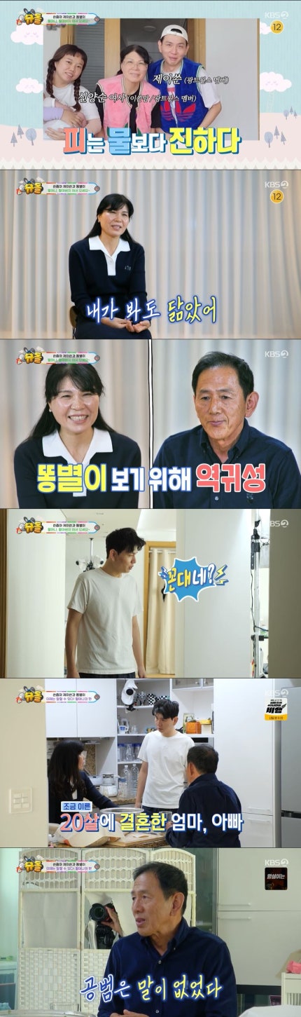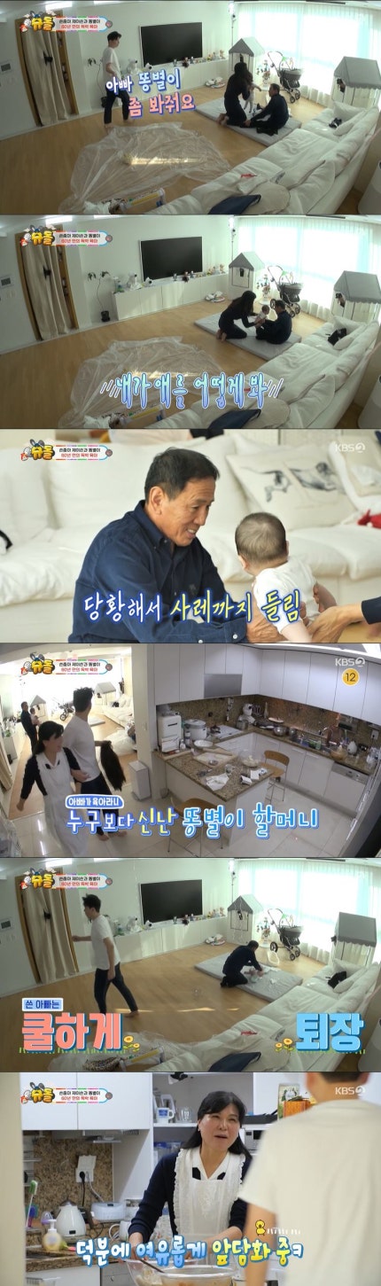 20일 방송된 KBS 2TV '슈퍼맨이 돌아왔다'(이하 '슈돌')은 '새해에도 꽃길만 깡총' 특집으로 꾸며졌다.KBS 2TV's "Superman is Back" (hereinafter referred to as "Superman"), which aired on the 20th, was decorated with a special feature of "Hopping Only Flower Roads in the New Year." 이날 방송에서는 똥별이네로 찾아온 할머니, 할아버지의 모습이 그려졌다.On this day's broadcast, grandmothers and grandfathers who came to the Ddongbyul's house were depicted.