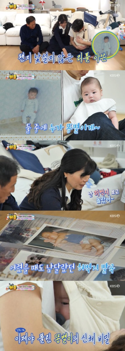 직접 만든 떡국까지 맛있게 먹은 세 사람은 이전 앨범을 찾아보며 추억에 빠졌다.The three, who enjoyed their own rice cake soup, fell into memories while looking for their previous album. 제이쓴은 똥별이와 똑같은 어릴 적 자신의 모습에 "진짜 신기하다"며 감탄했다.Jason said, "It's really amazing," admiring his childhood appearance just like Ddong Byul. 알고 보니 똥별이의 튼실한 허벅지는 제이쓴과 똑닮은 것이었다.It turned out that Ddong Byul's strong thighs looked just like Jason's. 어머니 역시 "허벅지 보고 깜짝 놀랐어"라고 덧붙여 판박이 DNA를 입증했다.The mother also added, "I was surprised to see my thigh," proving her exact DNA.