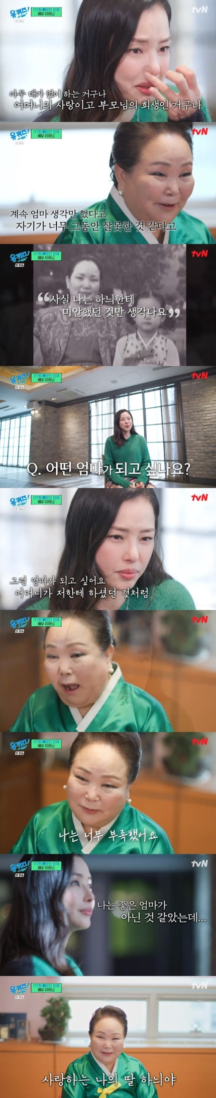 "어떤 엄마가 되고 싶냐"라는 물음에 "저도 그렇게 통 크고 맷집 좋은 엄마가 되는 게 꿈이다.When asked, "What kind of mother do you want to be?" she said, "My dream is to be such a generous and good mother." 우리 어머니가 저한테 하셨던 것처럼"이라고 답한 이하늬.Lee Ha-ni replied, "Just like what my mother did to me." 이에 문재숙 명인은 "너무 놀랄 일이다.Master Moon Jae-sook said, "It's so surprising. 나는 너무 부족했다.I wasn't good enough. 난 부족한 것만 생각나는데, 어떻게 그런 말을 했을까요?I can only think of what I lack, but how could I say that? 믿어지지가 않는다.I can't believe it. 나는 좋은 엄마가 아닌 거 같았는데, 너무 고마운 얘기다"라며 감동의 눈물을 흘렸다.I didn't think I was a good mother, but I'm so grateful," he said with tears of emotion.