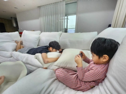 강경준은 15일 "남자들의 휴일"이라며 소파에서 쉬고 있는 두 아들의 모습을 포착했다.Kang Kyung-joon captured his two sons resting on the sofa on the 15th, calling it a "men's holiday."