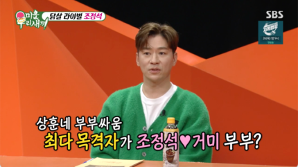 거미, 조정석 부부와 절친한 사이인 정상훈은 “우리 부부싸움도 둘이 가장 많이 봤다.Jung Sang-hoon, who is close to Gummy and Cho Jung-seok couple, said, "The two of us have also seen the most fights. 우리가 냉랭할 때 항상 온다.It always comes when we're cold. 와이프가 눈물이 많다.My wife cries a lot. 와이프가 울면 거미도 바로 운다.When his wife cries, so does the spider. 그러면 나는 되게 나쁜놈이 된다.Then I'll be a very bad guy. 그럴 때 정석씨가 내 편을 들어주면 좋은데, 그때 저한테 손가락질을 한다.In that case, it would be nice if Jung-seok took my side, but he points a finger at me then. 너무 얄밉다”라고 말해 좌중을 폭소케 했다.It's so annoying," he said, making the audience laugh.