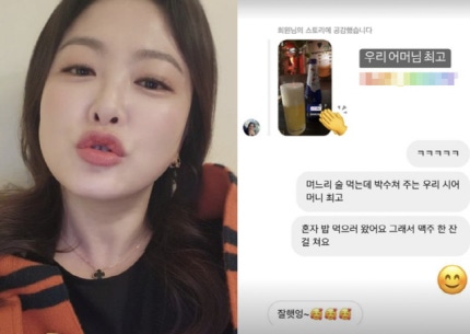 이에 심진화는 "며느리 술 먹는데 박수 쳐주는 우리 시어머니 최고.In response, Shim Jin-hwa said, "My mother-in-law, who claps when her daughter-in-law is drinking, is the best. 혼자 밥 먹으러 왔어요.I came to eat alone. 그래서 맥주 한 잔 걸쳐요"라 했고 시어머니는 "잘했어~"라며 며느리에게 답했다.So I'll have a beer," and my mother-in-law replied to her daughter-in-law, "Good job."